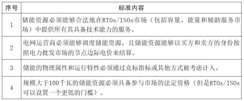 電力市場(chǎng)規(guī)則方面,美國(guó)對(duì)儲(chǔ)能參加電力市場(chǎng)比較重視,美國(guó)聯(lián)邦能源監(jiān)管委員會(huì)(FERC)2013年發(fā)布792號(hào)法令簡(jiǎn)化小型發(fā)電設(shè)備并網(wǎng)流程,2015年發(fā)布745號(hào)法令允許消費(fèi)端能源產(chǎn)品和服務(wù)參與批發(fā)電力市場(chǎng),2016年開始就儲(chǔ)能與分布式能源參與電力市場(chǎng)方面的規(guī)則進(jìn)行建議征集和全面修改。2018年2月,F(xiàn)ERC發(fā)布841號(hào)法令的草案,正式要求區(qū)域輸電組織(RTOs)和獨(dú)立系統(tǒng)運(yùn)營(yíng)商(ISOs)建立相關(guān)的批發(fā)電力市場(chǎng)模式、市場(chǎng)規(guī)則,包括儲(chǔ)能技術(shù)參數(shù),參與市場(chǎng)的規(guī)模要求以及資格等,以便使儲(chǔ)能可以參與RTOs/ISOs運(yùn)營(yíng)的所有電力市場(chǎng)。針對(duì)市場(chǎng)參與模式、市場(chǎng)規(guī)則的建立,F(xiàn)ERC提出四項(xiàng)標(biāo)準(zhǔn)(見表1)。在電力市場(chǎng)規(guī)則方面,除了FREC的841號(hào)法案外,美國(guó)儲(chǔ)能產(chǎn)業(yè)發(fā)展的主要思路包括將儲(chǔ)能列為獨(dú)立的電力資產(chǎn),定義儲(chǔ)能參與電力市場(chǎng)的模式,降低儲(chǔ)能參與電力市場(chǎng)的門檻等。