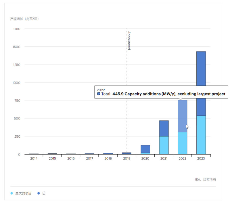 2014~2023年全球已投運和計劃投運電解氫產(chǎn)能(最大項目和總項目)