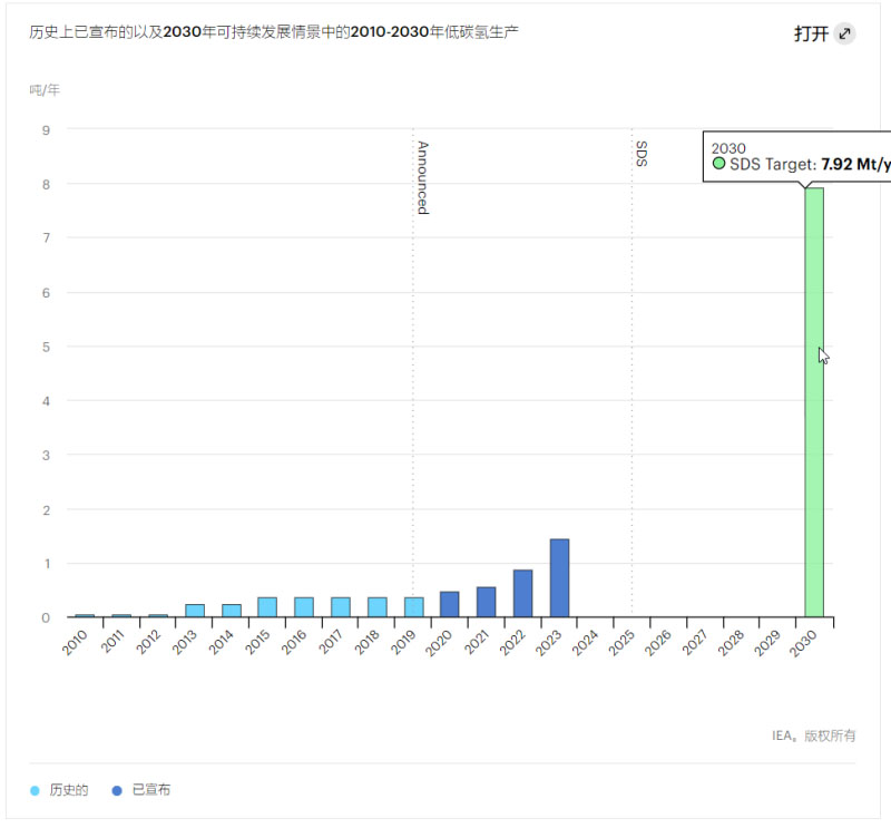 歷史上已宣布的以及2030年可持續(xù)發(fā)展情景(SDS)中的2010-2030年低碳氫生產(chǎn)