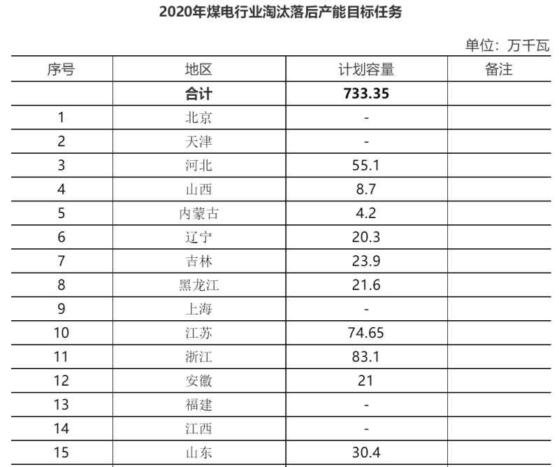 國(guó)家能源局發(fā)布關(guān)于下達(dá)2020年煤電行業(yè)淘汰落后產(chǎn)能目標(biāo)任務(wù)的通知稱,2020年全國(guó)計(jì)劃淘汰落后產(chǎn)能合計(jì)733.35萬(wàn)千瓦。淘汰機(jī)組中,凡屬未建成機(jī)組、2015年1月1日后無(wú)運(yùn)行記錄機(jī)組,不計(jì)入煤電行業(yè)淘汰落后產(chǎn)能目標(biāo)任務(wù)。列入本年度煤電行業(yè)淘汰落后產(chǎn)能目標(biāo)任務(wù)的煤電機(jī)組,除明確作為煤電應(yīng)急備用電源的機(jī)組外,須在2020年12月底前完成拆除工作。對(duì)于未納入國(guó)家年度淘汰落后產(chǎn)能目標(biāo)任務(wù),已停運(yùn)多年、短期內(nèi)不具備恢復(fù)生產(chǎn)條件的“僵尸”煤電機(jī)組,各地要結(jié)合實(shí)際情況,推動(dòng)企業(yè)盡快完成淘汰關(guān)停工作。