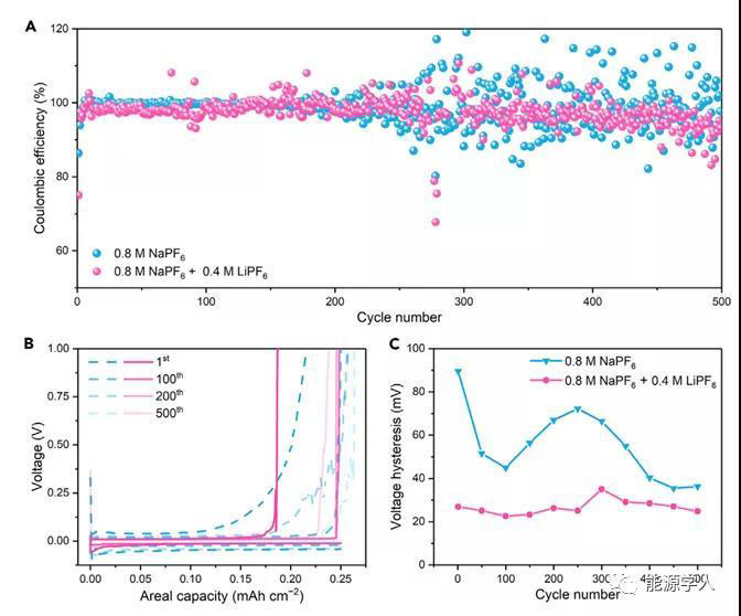 進(jìn)一步進(jìn)行電化學(xué)測(cè)試,以證明鋰離子添加劑在鈉金屬電池中的實(shí)際性能。結(jié)果顯示,使用Li+添加劑,可以顯著提高200次循環(huán)后的庫(kù)侖效率。更重要的是,Li+添加劑可顯著降低電壓滯后。此外,Li+添加劑對(duì)Na剝離行為也有明顯影響。