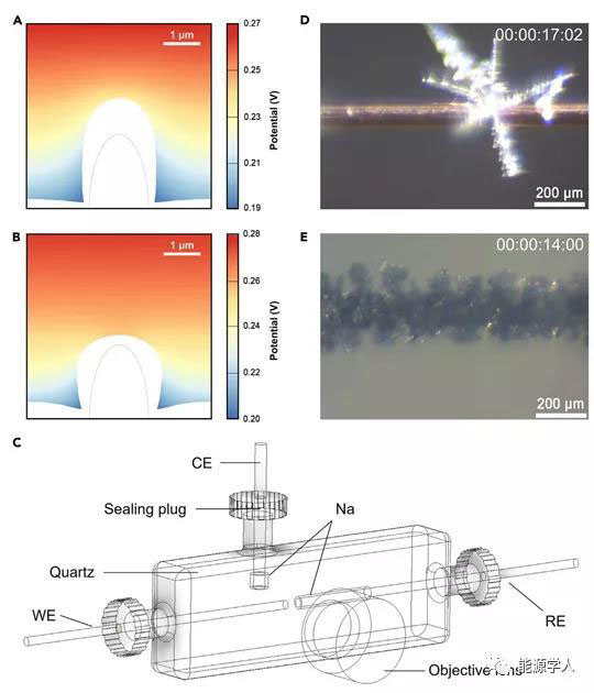 為了證明陽(yáng)離子添加劑對(duì)鈉沉積的靜電屏蔽效應(yīng),進(jìn)行了有限元模擬和原位光學(xué)顯微鏡觀察。陽(yáng)離子添加劑對(duì)鈉沉積產(chǎn)生靜電屏蔽作用,抑制鈉枝晶生長(zhǎng)。
