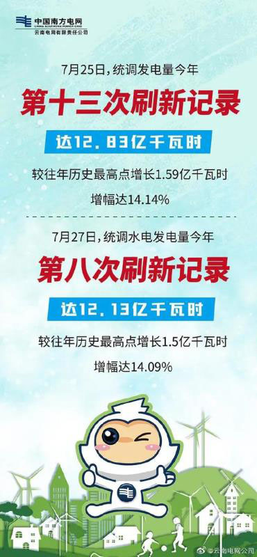 云南電網(wǎng)統(tǒng)調(diào)發(fā)電負(fù)荷、發(fā)電量連續(xù)多次創(chuàng)新高。6月20日、23日和27日,云南電網(wǎng)統(tǒng)調(diào)發(fā)電量連續(xù)3次創(chuàng)歷史新高,分別達(dá)到11.34億千瓦時、11.58億千瓦時和11.73億千瓦時。