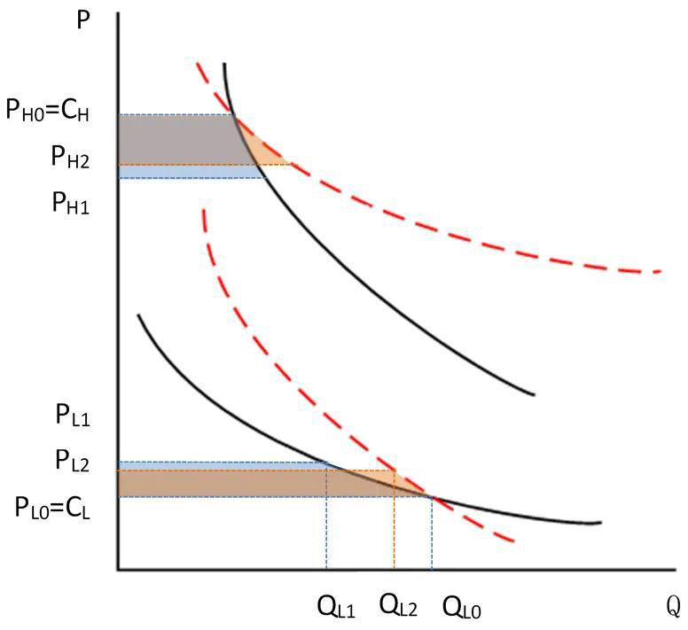 令f1 (p)和f2 (p)分別是需求曲線的函數(shù),以低成本用戶為例,PL1>CL,PL2>CL,可得: