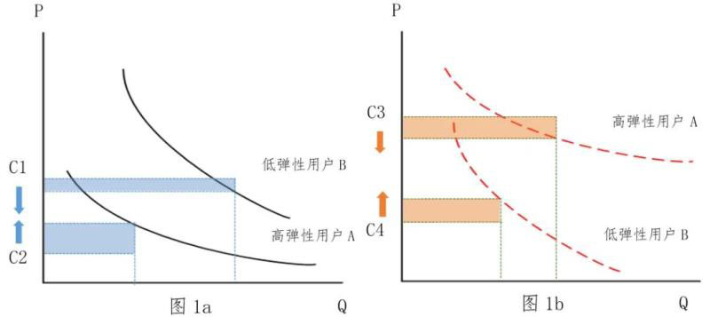 需求曲線的斜率和相對(duì)位置確定后,上述兩類電價(jià)交叉補(bǔ)貼在量?jī)r(jià)坐標(biāo)系中的“開口”形態(tài)就被固定下來(lái),如圖1所示:高彈性用戶向低彈性用戶支付交叉補(bǔ)貼時(shí),生產(chǎn)者剩余增減的絕對(duì)值相等(藍(lán)色陰影面積),兩條需求曲線圍成了向上開口的形態(tài),可稱之為“上開口型”電價(jià)交叉補(bǔ)貼(圖1a);低彈性用戶向高彈性用戶支付交叉補(bǔ)貼時(shí),生產(chǎn)者剩余增減的絕對(duì)值也相等(紅色陰影面積),兩條需求曲線圍成了向下開口的形態(tài),可稱之為“下開口型”電價(jià)交叉補(bǔ)貼(圖1b)。