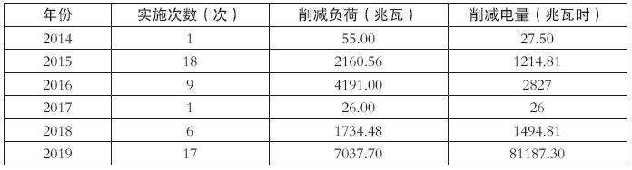 在需求響應(yīng)實(shí)施早期,實(shí)施目的主要是為了應(yīng)對(duì)夏季高峰時(shí)段電力消費(fèi)緊張狀況,最大程度削減高峰電力負(fù)荷對(duì)電網(wǎng)安全的影響,保障了民生用電和重點(diǎn)用電安全平穩(wěn)。2014~2019年度國(guó)內(nèi)開(kāi)展削峰需求響應(yīng)的情況如下表所示。