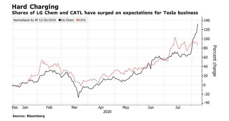 ▲LG化學與寧德時代占特斯拉電池的份額走勢