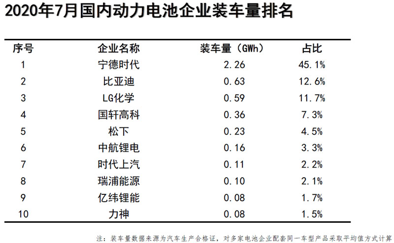 7月動力電池企業(yè)裝車量排名中,寧德時代、比亞迪、LG化學分別以2.26GWh、0.63GWh和0.59GWh包攬前三,比亞迪超越LG化學上升至第二位。