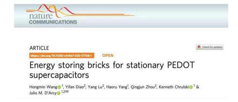 根據(jù)論文的描述,研究人員利用磚的多孔結構,通過使用氣相沉積技術為紅磚添加一層名為 PEDOT 的導電聚合物,從而把紅磚變成一個儲能電極。充電后的儲能磚可以作為超級電容器像傳統(tǒng)電池一樣儲存電能,并隨時為其他裝置供電,由儲能磚砌成的墻可以儲存大量電能。