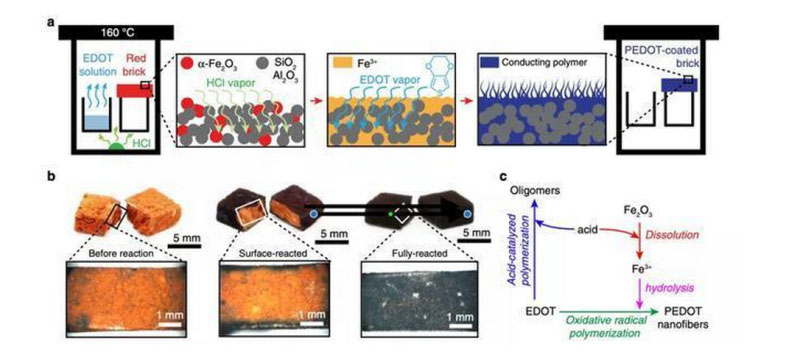 圖|將紅磚表面的氧化鐵轉化為一種藍色可導電塑料(來源:Nature Communications)