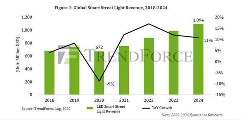 TrendForce在其最新調(diào)查中預(yù)測,全球LED智能路燈市場(僅包括照明器和單個照明控制系統(tǒng))將迎來快速發(fā)展,到2024年,將以8.2%的復(fù)合年增長率增長。