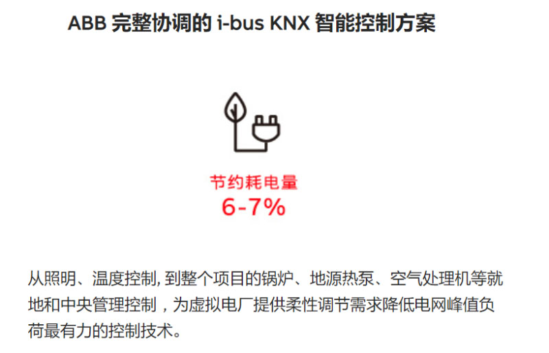 協調控制技術方面, ABB i-bus KNX智能控制系統(tǒng)提供照明、鍋爐、地源熱泵、空調機組等設備的就地和集中控制,為用電負荷實現柔性調節(jié),降低電網峰值負荷。例如,在冀北電網營銷大樓中,通過對前端10臺空調機組進行進回水溫差設定。當回水溫度低于設定值時,系統(tǒng)將會自動停止1臺空調工作,可立即降低該空調機組負荷的10%。通過優(yōu)化控制策略,實現在不犧牲用戶舒適性的前提下減少用電負荷。