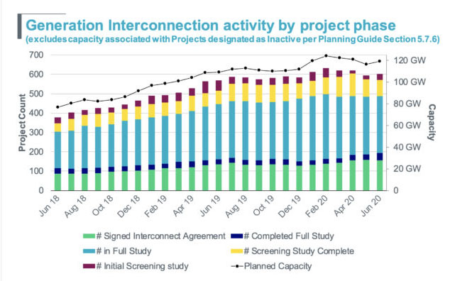 儲能開發(fā)商在今年要求德州電力可靠性委員會(ERCOT)對總計(jì)裝機(jī)容量4.9GW的32個(gè)電池儲能項(xiàng)目進(jìn)行全面互連研究,而德州電力可靠性委員會(ERCOT)在今年只完成了9項(xiàng)研究,其裝機(jī)容量總計(jì)僅為0.7GW。在2019年,德州電力可靠性委員會(ERCOT)只批準(zhǔn)了總裝機(jī)容量為205MW的兩個(gè)電池儲能項(xiàng)目,與此同時(shí)卻收到了43項(xiàng)電池儲能系統(tǒng)審批申請,其總裝機(jī)容量為4.1GW。
