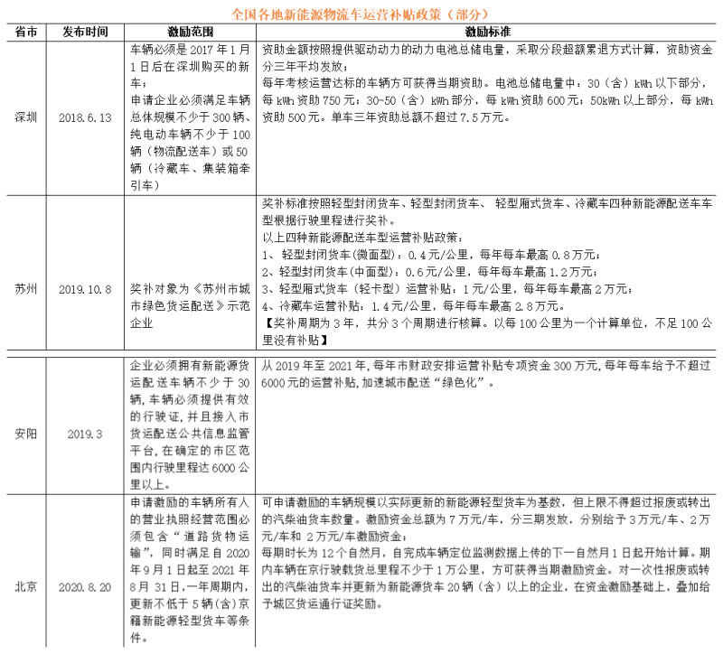 記者梳理發(fā)現(xiàn),截至目前,全國已有多個城市對新能源輕型貨車及物流車提出專項運營補貼,包括深圳、蘇州、安陽、北京等。此外,據(jù)了解,義烏等城市也將出臺新能源物流車運營補貼政策。