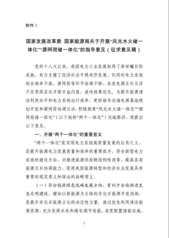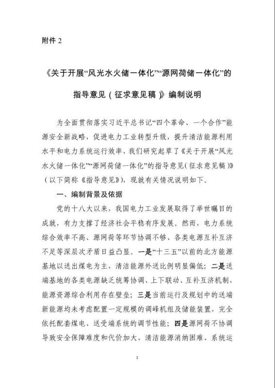 附件:1.國家發(fā)展改革委 國家能源局關于開展“風光水火儲一體化”“源網(wǎng)荷儲一體化”的指導意見(征求意見稿)