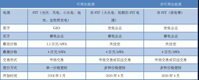 如表5所列,非化石價值證書分為可再生能源,非可再生能源兩大類,核電被劃定為非可再生能源類,其用途僅限于向政府主管部門申報碳排放核減之用??稍偕茉搭愑挚煞譃镕IT電力(可再生能源)和非FIT電力(包括大水電以及到期的FIT可再生能源)兩類。因此,非化石價值證書總共三種:FIT非化石價值證書(可再生能源),非FIT非化石價值證書(可再生能源),非FIT非化石價值證書(非可再生能源)。其中FIT非化石價值證書從2018年5月起開始交易,出售方為FIT資金管理機(jī)構(gòu)(低碳投資促進(jìn)機(jī)構(gòu),GIO),購買方為售電企業(yè),F(xiàn)IT非化石證書競拍最高限價為4日元/kWh,最低限價為1.3日元/kWh。原則上競拍每季度舉行一次。非FIT非化石價值證書將從2020年4月開始競拍。政府希望通過市場交易回收部分可再生能源補(bǔ)貼費(fèi)用。