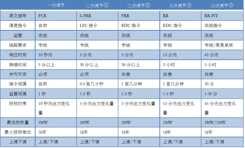 響應(yīng)時間最快的是一次調(diào)節(jié)服務(wù),電網(wǎng)的頻率一旦偏離額定值時,機(jī)組的控制系統(tǒng)就會自動地根據(jù)負(fù)荷的變化控制機(jī)組有功功率的增減,限制電網(wǎng)頻率變化,響應(yīng)時間在10秒以內(nèi),持續(xù)時間5分鐘以上,適用于可變速機(jī)組(GF)和可瞬間響應(yīng)的儲能設(shè)備。