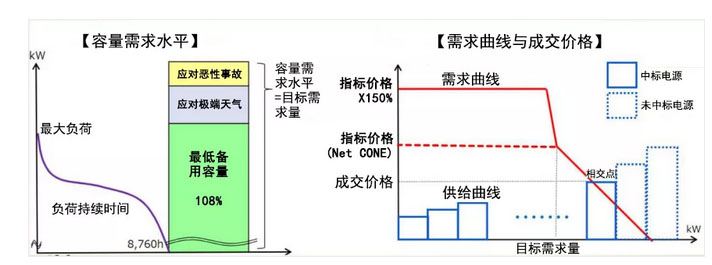 日本容量市場是集中式的容量市場,容量需求和指標(biāo)價格由OCCTO確定[12]。OCCTO根據(jù)2019年度的供電計(jì)劃,目前設(shè)定2024年容量需求為1.8億kW,如圖12(左)所示,容量需求的計(jì)算依據(jù)是:系統(tǒng)最低備用容量為H3的8%,應(yīng)對極端天氣的備用容量為H3的2%以及應(yīng)對惡性事故的備用容量為H3的1%。圖12(右)為反映容量價格與容量需求量關(guān)系的曲線,OCCTO以新建機(jī)組的投資回收年限設(shè)定指標(biāo)價格(Net CONE),現(xiàn)為9444日元/kW,競標(biāo)上限價格不得超過指標(biāo)價格的150%[13]。OCCTO以容量目標(biāo)水平為基礎(chǔ)設(shè)定需求曲線,以發(fā)電企業(yè)投標(biāo)容量形成供給曲線,以投標(biāo)價格與需求價格的相交點(diǎn)確定成交價格,當(dāng)?shù)陀谀繕?biāo)需求量時價格急速跳高,當(dāng)高于需求量時價格緩慢下落,所有交易成功的容量都將按這個價格支付費(fèi)用。