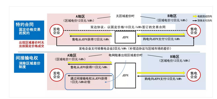 通常輸電權(quán)可以分為物理輸電權(quán)和金融輸電權(quán),分別表現(xiàn)為對于輸電容量的使用權(quán)和收益權(quán)。2019年4月,日本啟動了間接輸電權(quán)交易市場,其中輸電權(quán)是指物理跨區(qū)輸電容量的使用權(quán),輸電權(quán)所有者僅有自己獲得相關(guān)輸電服務(wù)的權(quán)力,不可以轉(zhuǎn)賣,沒有收益權(quán)。間接輸電權(quán)一般是指當(dāng)電網(wǎng)發(fā)生阻塞時,在現(xiàn)貨批發(fā)市場所約定的電能量范圍內(nèi),交易方有權(quán)要求JEPX支付區(qū)域市場差價的權(quán)利。因此,日本的間接輸電權(quán)可稱為“責(zé)任型”輸電權(quán),是分區(qū)電價結(jié)算差價的一種契約,而非歐美國家的權(quán)益型輸電權(quán)[10]。