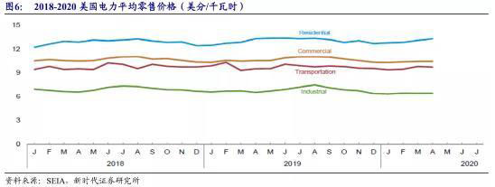 美國民用電價高昂,為當?shù)貞粲霉夥焖侔l(fā)展提供天然土壤。工業(yè)用電具備規(guī)?;?,價格僅為民用電價的一半。根據(jù)美國能源信息署的數(shù)據(jù),2020年4月 份美國平均居民電價為13.28美分/千瓦時,由于工業(yè)用電具備規(guī)模效應,成本更低, 美國工業(yè)用電價格大約為民用電價的一半,僅為6.41美分/千瓦時。因此,從成本端考慮能源替代的角度,民用電價高昂為美國戶用光伏快速發(fā)展提供天然土壤。