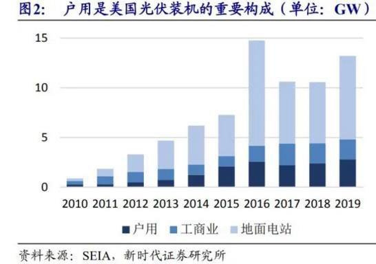 美國光伏穩(wěn)定增長,戶用光伏成長趨勢明顯。根據(jù)SEIA數(shù)據(jù),2019年美國光 伏新增裝機13.3GW,同+25.5%,其中戶用光伏新增裝機2.8GW,同比+16.7%, 戶用是美國光伏裝機的重要構(gòu)成,占全年新增裝機21.05%。光伏系統(tǒng)成本下降帶來的經(jīng)濟性及支持政策,是美國戶用光伏發(fā)展的重要因素。