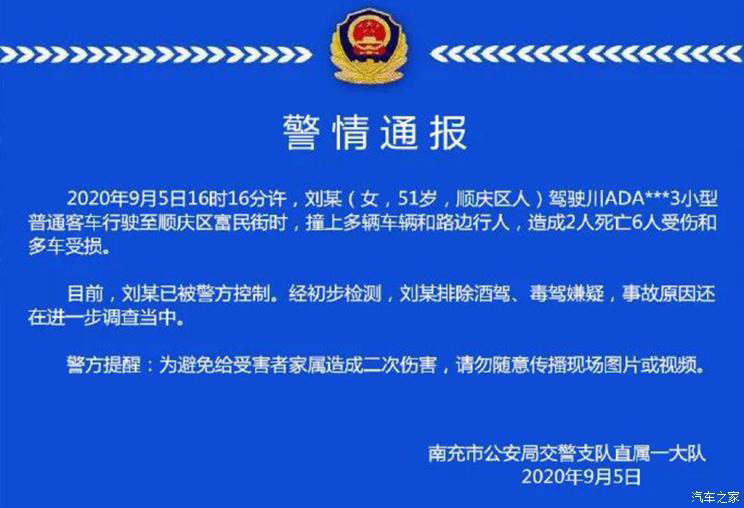 警情通報顯示,劉某(女,51歲,順慶區(qū)人)駕駛川ADA***3小型普通客車(特斯拉Model X)行駛至順慶區(qū)富民街時發(fā)生事故,目前劉某已被警方控制,且經(jīng)過初步檢測,已排除劉某酒駕、毒駕嫌疑,但事故原因還在進一步調(diào)查中。