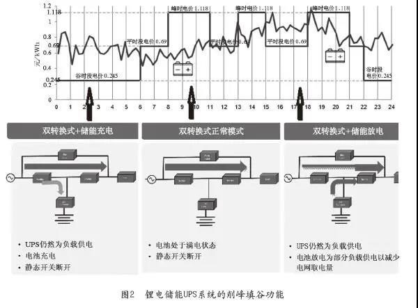 這就要求UPS系統(tǒng)對其整流器、充電器、直流母線系統(tǒng)的精確控制和監(jiān)控能力。憑借著多項(xiàng)運(yùn)算及控制處理專利技術(shù),伊頓93PR600kW系統(tǒng)具備了這種智能電力調(diào)配功能,在鋰電儲能系統(tǒng)的應(yīng)用基礎(chǔ)上,預(yù)留部分容量以應(yīng)對在市電斷電期間仍然為重要負(fù)荷提供后備電源的前提下,在電價(jià)低時(shí)對鋰電池系統(tǒng)充電儲能;在電價(jià)高時(shí)精確控制市電供電與鋰電池放電電力的比例以平移高峰時(shí)段用電量,削峰填谷;在負(fù)荷高峰時(shí)段放電以避免用電量溢出。在同等的電力使用量的情況下,通過削峰填谷的智能電力調(diào)配來達(dá)到節(jié)約數(shù)據(jù)中心電費(fèi)開支的目的(見圖2)。