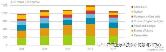 能源技術(shù)創(chuàng)新,包括研發(fā)(R&D)是歐洲“能源聯(lián)盟”的五大支柱之一。近年來,歐盟一直在增加對能源研發(fā)的資助,“地平線歐洲”計(jì)劃在氣候、能源和交通方面投入150億歐元,在氣候行動方面投入350億歐元。2018年“地平線2020”能源預(yù)算的一半用于可再生能源(占總量的27%)和能源效率(占23%)(圖1)。其中可再生能源的資金分配主要包括太陽能、風(fēng)能、生物能源、地?zé)岷秃Q竽茉搭I(lǐng)域。而對能效技術(shù)的資助中,約三分之一用于工業(yè),其次用于建筑、交通和其他能效領(lǐng)域。2018年,電力和儲能及其他交叉技術(shù)合計(jì)占能源研發(fā)總量的30%自2016年以來,用于交叉研究的資金在總預(yù)算中的份額翻了一番。