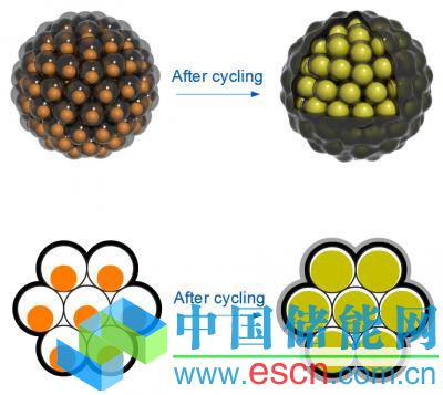而每一個石榴群簇暴露的表面僅為內(nèi)部納米粒子攤開后表面的1/10,因此與原來相比,與電解液接觸的區(qū)域小了很多,產(chǎn)生的粘性物質(zhì)自然也減少了,令電池更可控。