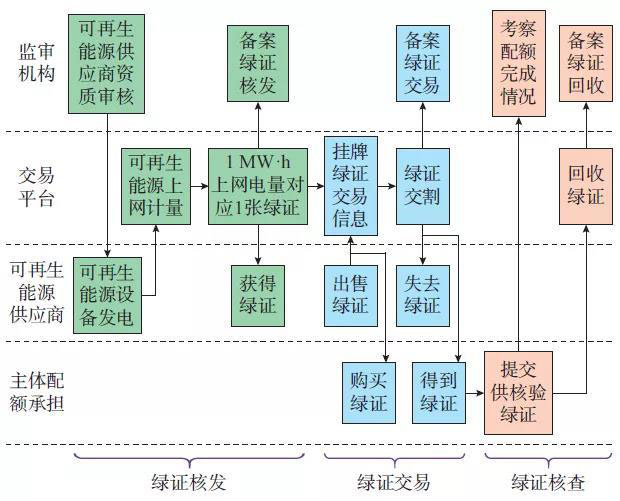 電網(wǎng)依據(jù)安裝在發(fā)電商處的上網(wǎng)關口表數(shù)據(jù),每1 MW·h可再生電力上網(wǎng)后,將自動生成一個編號唯一的綠證。對于場內(nèi)交易,綠證所有者可以發(fā)布掛牌信息,其他主體可以摘牌購買。在每年規(guī)定的配額制考核時間,由監(jiān)審部門確定配額考核指標,核查監(jiān)督各主體配額完成情況,并自動扣除當年對應的綠證數(shù)目,完成綠證回收。