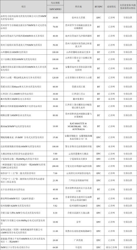 根據(jù)2020年半年報,了解到陽光電源的28個光伏電站以及5MW以下小型分布式項目的相關(guān)情況,這些光伏項目總規(guī)模為1351.41MW(約1.35GW),所有項目的逆變器皆自供;其中除了衢州集聚區(qū)30MW農(nóng)光互補項目和達(dá)拉特旗領(lǐng)跑者基地100MW光伏發(fā)電項目還未并網(wǎng),其他26個項目全都完成了并網(wǎng),詳情如下: