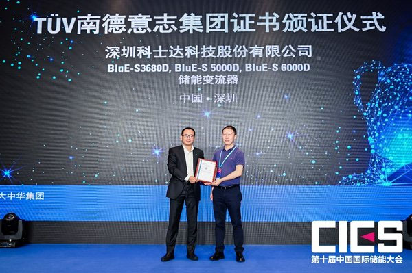 中國儲能網(wǎng)訊:9月24-26日,由中國化學(xué)與物理電源行業(yè)協(xié)會主辦,TUV南德意志集團(tuán)(以下簡稱“TUV南德”)聯(lián)合主辦,中國化學(xué)與物理電源行業(yè)協(xié)會儲能應(yīng)用分會、中國儲能網(wǎng)承辦的第十屆中國國際儲能大會在深圳鵬瑞萊佛士酒店隆重召開。大會吸引了全球儲能行業(yè)眾多領(lǐng)軍企業(yè)參與,共同探討儲能技術(shù)在高安全、低成本、長壽命以及資源再利用全生命周期的研究與布局,推動儲能價值的市場機(jī)制建設(shè)、推進(jìn)先進(jìn)大容量儲能系統(tǒng)技術(shù)在高比例可再生能源電網(wǎng)的規(guī)模化應(yīng)用,有力構(gòu)建以市場為導(dǎo)向的綠色技術(shù)創(chuàng)新體系。9月25日,在儲能安全、標(biāo)準(zhǔn)與檢測分會場上,TUV南德為深圳科士達(dá)科技股份有限公司(以下簡稱“深圳科士達(dá)”)BluE系列儲能變流器頒發(fā)TUV SUD安全認(rèn)證證書。TUV南德大中華集團(tuán)智慧能源事業(yè)部副總裁許海亮,深圳科士達(dá)認(rèn)證部總監(jiān)李彬等一席嘉賓出席了該頒證儀式。該證書的獲得,為科士達(dá)進(jìn)一步進(jìn)軍儲能國際市場奠定了良好的基礎(chǔ)。
