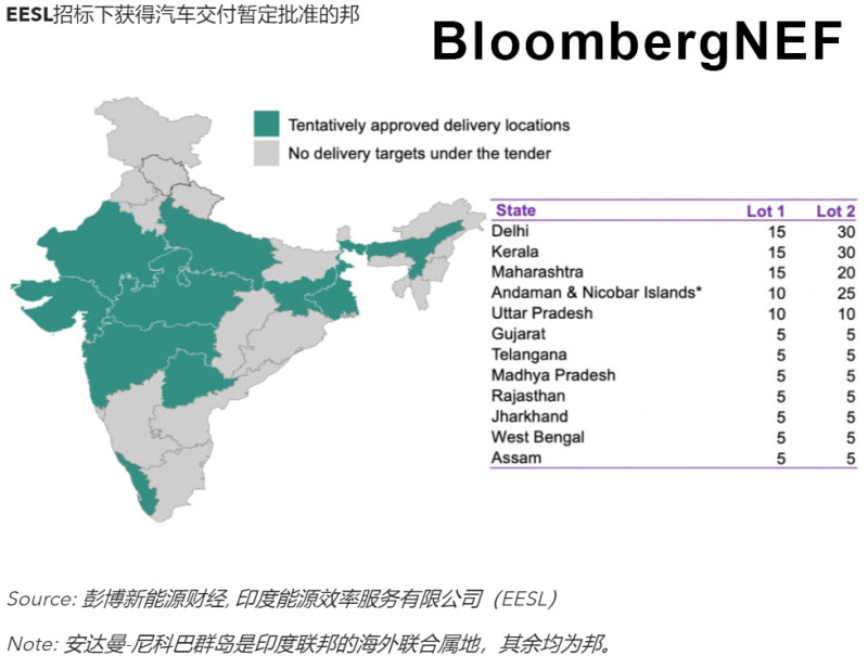 EESL已初步公布了招標名單,包括接受新能源汽車的邦及各邦的采購量。德里和喀拉拉邦的采購數(shù)量最大,各為45輛,其次是馬哈拉施特拉邦和安達曼與尼科巴群島。招標沒有明確規(guī)定交付時間。在可能接受交付的各邦里,中央邦、北方邦和德里已經(jīng)設下了政府車輛100%電動化的目標。