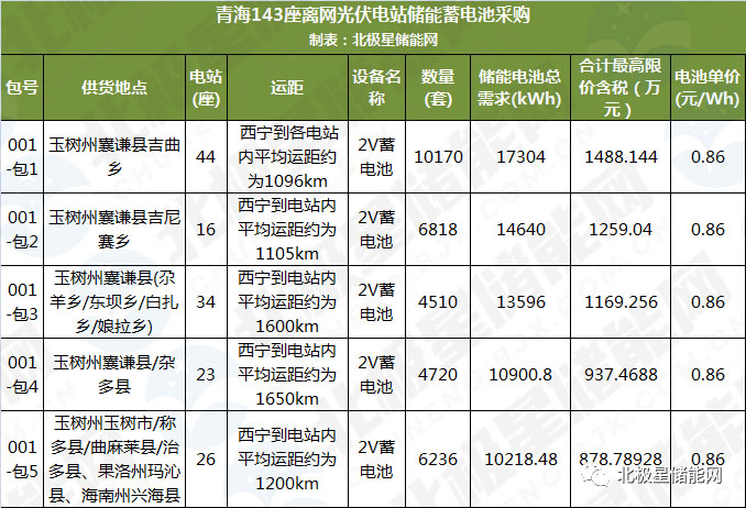 青海德坤電力有限公司發(fā)布143座離網(wǎng)光伏電站儲能蓄電池及19座離網(wǎng)光伏電站逆控設(shè)備物資招標(biāo)采購,其中標(biāo)包1~標(biāo)包5共143座光伏電站合計采購儲能電池34254套、約66.66MWh,最高限價含稅5732.7萬元,單價約0.86元/Wh。