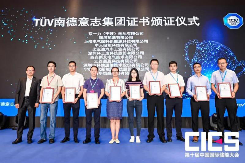 在儲能安全、標(biāo)準(zhǔn)與檢測分會場上,TüV南德特別為12家儲能企業(yè)現(xiàn)場頒發(fā)了產(chǎn)品認(rèn)證證書。獲頒產(chǎn)品認(rèn)證證書的企業(yè)分別為:雙一力(寧波)電池有限公司,瑞浦能源有限公司,上海電氣國軒新能源科技有限公司,中天儲能科技有限公司,江蘇為恒智能科技有限公司,比亞迪汽車工業(yè)有限公司,深圳科士達(dá)科技股份有限公司,西安新艾電氣技術(shù)有限公司,江西星盈科技有限公司,深圳市科信通信技術(shù)股份有限公司,寧德時代新能源科技股份有限公司以及科華恒盛股份有限公司。