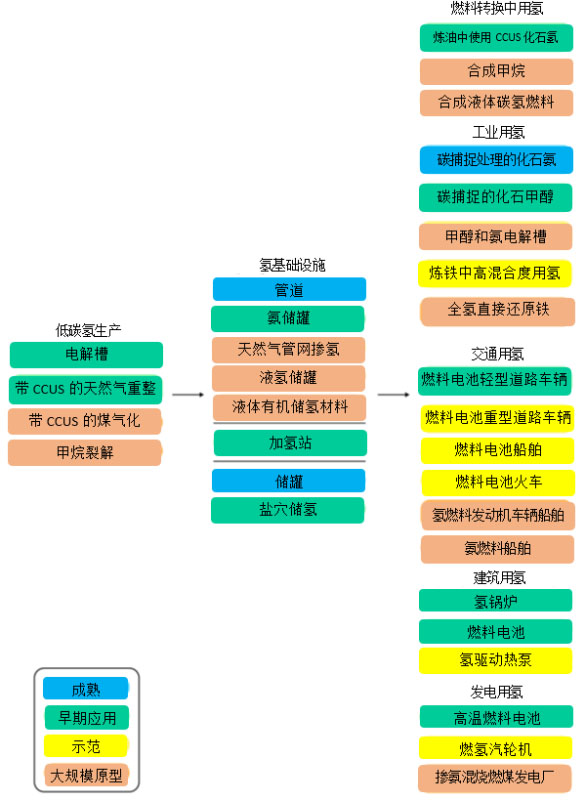 IEA認為,目前的低碳氫價值鏈中,氫的生產(chǎn)、運輸、儲存和應用所需的各項技術(shù)都處于不同的成熟階段,并面臨特定的技術(shù)問題(圖1)。