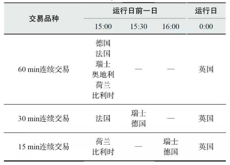 日內(nèi)連續(xù)交易市場針對各國交易體系的特點(diǎn)共設(shè)置了60分鐘連續(xù)交易、30分鐘連續(xù)交易及15分鐘連續(xù)交易三個交易產(chǎn)品,所有產(chǎn)品于運(yùn)行日前一日15:00時開始,連續(xù)交易直至運(yùn)行日各國市場交割前。市場交易時序如表1所示。