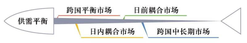 歐洲跨國電力市場是通過跨國輸電網(wǎng)的運(yùn)營及市場聯(lián)合出清將多個國家的電力市場聯(lián)結(jié)在一起。截止2019年,歐盟電力系統(tǒng)已覆蓋36個國家及43個輸電網(wǎng)運(yùn)營商TSO(Transmission System Operator),基本建成了從年度到實(shí)時的跨國市場運(yùn)行,市場框架如圖 1所示,包括跨國中長期市場、日前耦合市場、日內(nèi)耦合市場、以及跨國平衡市場。