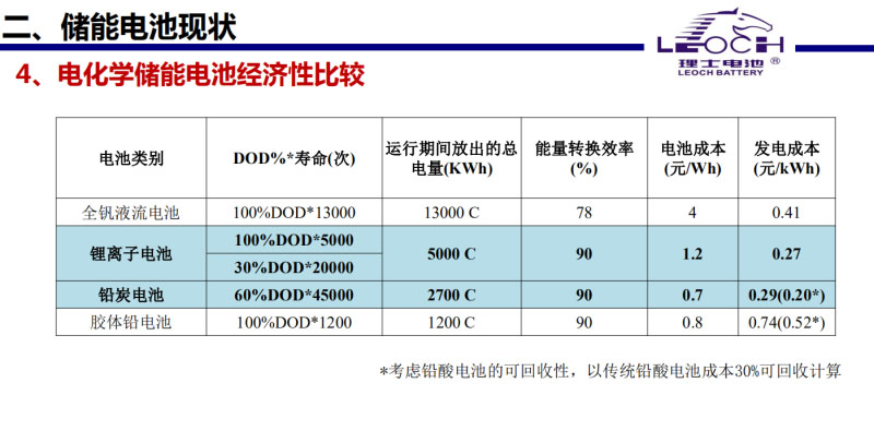 這是從經(jīng)濟(jì)性上比較的,發(fā)電成本只是純電池,不包括系統(tǒng)。如果要算系統(tǒng),按最后的成本可能要乘2-3,也不包括充電。目前看來鋰離子電池和鉛炭電池有優(yōu)勢。鉛炭電池雖然慢慢被取代,但到目前為止還是唯一一個(gè)能夠循環(huán)利用的,其他的體系的電池還都做不到,所以它還仍然有生命力。