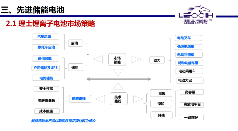二、鋰電池策略。我們主要是做磷酸鐵鋰電池,鋰電池應(yīng)用于通信儲(chǔ)能、電網(wǎng)儲(chǔ)能,低速電車車,再就是摩托車、汽車啟動(dòng)。我們生產(chǎn)設(shè)備也兼容三元鋰和錳酸鋰。