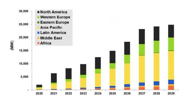 Guidehouse的分析師表示,就在幾年前,全球許多地區(qū)還認(rèn)為公用事業(yè)規(guī)模的儲(chǔ)能“過于昂貴或復(fù)雜,無法融入能源市場(chǎng)”,但自那以后出現(xiàn)了“重大轉(zhuǎn)變”。Guidehouse預(yù)計(jì),到2029年,全球年度裝機(jī)容量將達(dá)到2.5萬MW,2021年將超過5000MW,是今年的兩倍多。