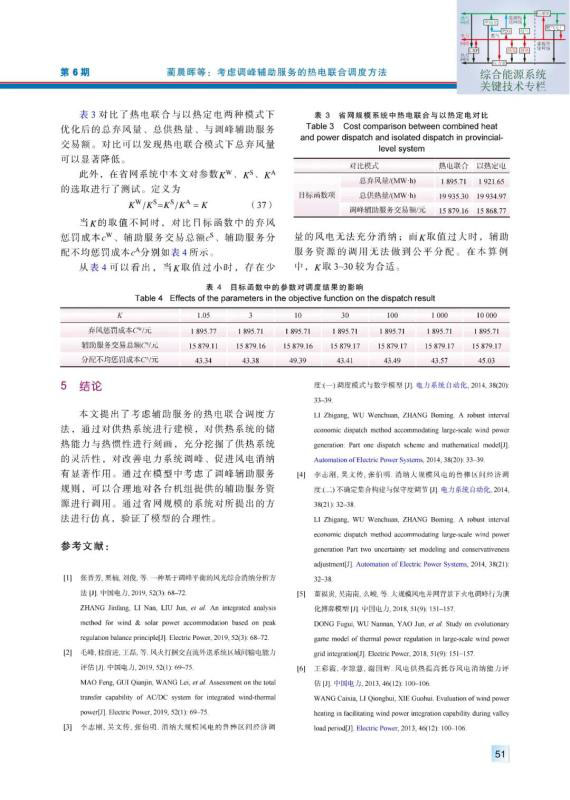 結(jié)論:本文提出了考慮輔助服務(wù)的熱電聯(lián)合調(diào)度方法,通過對(duì)供熱系統(tǒng)進(jìn)行建模,對(duì)供熱系統(tǒng)的儲(chǔ)熱能力與熱慣性進(jìn)行刻畫,充分挖掘了供熱系統(tǒng)的靈活性,對(duì)改善電力系統(tǒng)調(diào)峰、促進(jìn)風(fēng)電消納有顯著作用。通過在模型中考慮了調(diào)峰輔助服務(wù)規(guī)則,可以合理地對(duì)各臺(tái)機(jī)組提供的輔助服務(wù)資源進(jìn)行調(diào)用。通過省網(wǎng)規(guī)模的系統(tǒng)對(duì)所提出的方法進(jìn)行仿真,驗(yàn)證了模型的合理性。