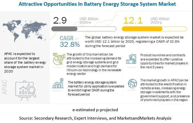國(guó)際市場(chǎng)研究機(jī)構(gòu)Markets and Markets日前發(fā)布的報(bào)告稱,2020年全球電池儲(chǔ)能系統(tǒng)市場(chǎng)規(guī)模預(yù)計(jì)將達(dá)到29億美元,到2025年,這一數(shù)據(jù)有望增至121億美元,期間年復(fù)合增長(zhǎng)率達(dá)到32.8%。