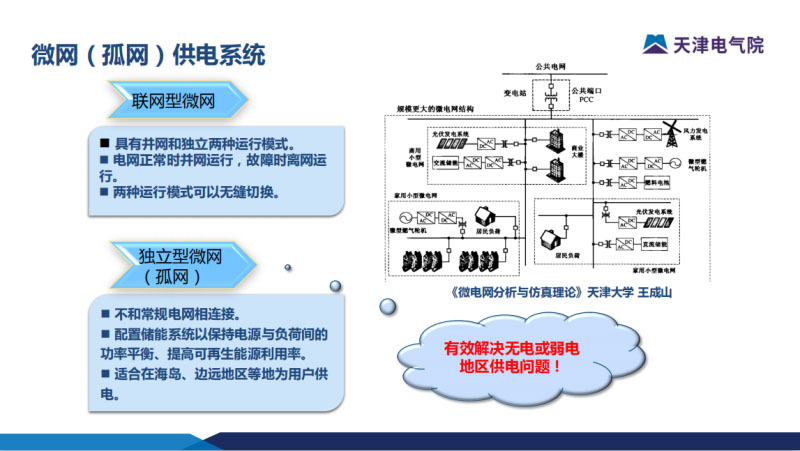 我們跟天津大學(xué)的王教授有非常深度的合作,對(duì)于電網(wǎng)的分類,一般就是聯(lián)網(wǎng)型或者是獨(dú)立型。聯(lián)網(wǎng)型就是跟大電網(wǎng)有PCC節(jié)點(diǎn),但是也具有獨(dú)立運(yùn)行的能力。在電網(wǎng)建成的時(shí)候,并網(wǎng)進(jìn)行,離網(wǎng)的時(shí)候快速的切換。我們更多的關(guān)注是獨(dú)立型的微網(wǎng),有別于常規(guī)電網(wǎng),獨(dú)立型微電網(wǎng)相對(duì)比較弱,需要配置儲(chǔ)能作為符合和電源之間的功率平衡,提高新能源的滲透率。這是一種有效解決無(wú)電或者是弱電的技術(shù)綜合性的解決方案。