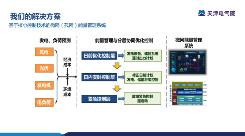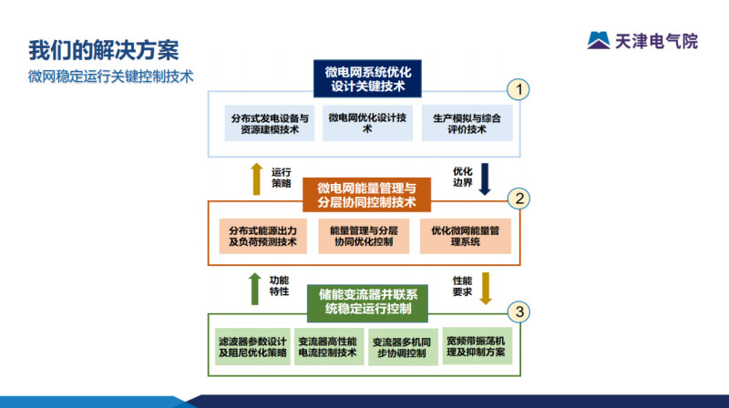 那如何解決微電網(wǎng)供電穩(wěn)定性的問(wèn)題?基于儲(chǔ)能系統(tǒng)和相關(guān)的控制技術(shù)去構(gòu)建微網(wǎng)運(yùn)行解決方案。上午科華的領(lǐng)導(dǎo)也有提到關(guān)鍵環(huán)節(jié)的突破系統(tǒng),包括重新啟動(dòng)、多機(jī)并列,這些也是相關(guān)的研究領(lǐng)域。