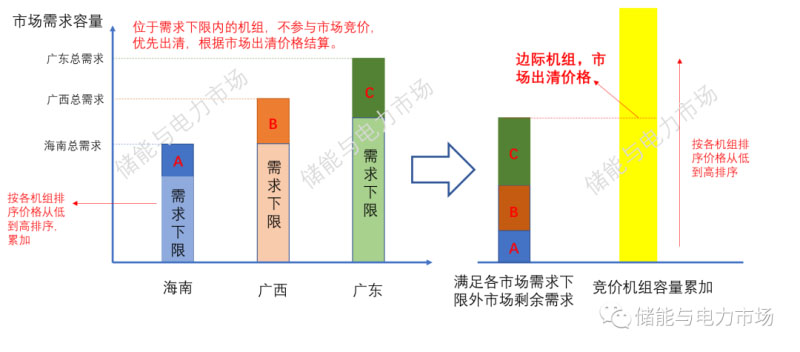 左圖中,滿足各區(qū)域市場容量需求下限內(nèi)的機(jī)組,不參與市場競爭,將優(yōu)先提供服務(wù),結(jié)算價(jià)格由市場出清價(jià)格決定。