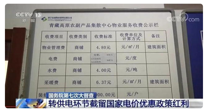 在西寧市青藏高原農(nóng)副產(chǎn)品集散中心,督查組看到物業(yè)服務(wù)收費公示欄顯示,商鋪繳納的電費標(biāo)準是每度1.2元,由0.53元的電度電價和0.67元的公共設(shè)施用電及損耗費兩部分組成。而《中華人民共和國電力法》規(guī)定,任何單位和個人禁止在電費中加收其他費用。督查組調(diào)查發(fā)現(xiàn),該集散中心從電網(wǎng)企業(yè)的最新購電均價僅為0.48元/度,而供給商戶卻收取1.2元/度,加價幅度達到了150%。督查組走訪了部分商戶,均反映集散中心一直按每度1.2元的標(biāo)準收電費,自2018年以來從來沒有降過價,沒有將國家連續(xù)3年實施的降電價政策紅利及時足額傳導(dǎo)下去。