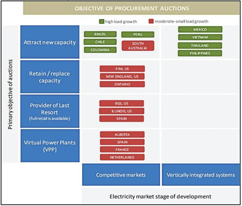電力行業(yè)也廣泛地應(yīng)用各種各樣的拍賣方式作為交易方式,例如許多發(fā)展中國家就針對電廠和輸電資產(chǎn)的特許經(jīng)營權(quán)運用了第一價格暗標(biāo)拍賣,而電力市場集中競價交易中常談到的統(tǒng)一出清以及按報價支付(Pay as Bid)實質(zhì)也是兩種拍賣方式,美國、西班牙、哥倫比亞等國則在容量市場采用“荷式時鐘拍賣”。