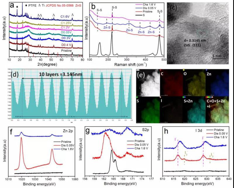 圖4 S@CNTs-50電極的充放電產(chǎn)物的結(jié)構(gòu)表征。(a)不同電位下XRD圖譜,(b)不同電位下Raman光譜,(c,d)放電下產(chǎn)物的TEM照片和晶面層間距,(e)放電產(chǎn)物的TEM mapping, 和(f-g)不同狀態(tài)下的XPS圖譜 。