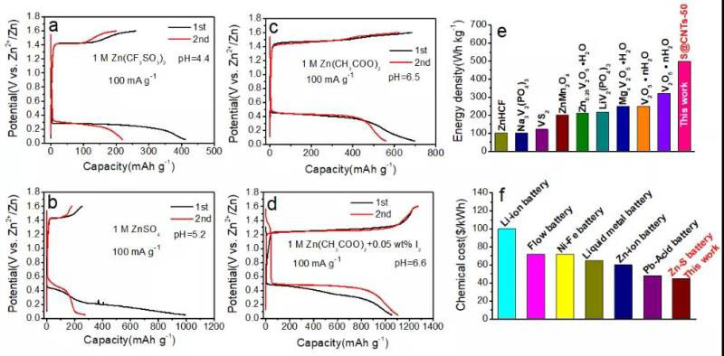 圖2 S@CNTs-50 電極的電化學性能。S@CNTs-50在(1)1 M Zn(CF3SO3)2,(2) 1 M ZnSO4,(3) 1 M Zn(CH3COO)2 和(d)1 M Zn(CH3COO)2+ I2鋅溶液中的充放電曲線。S@CNTs-50電極的(e)能量密度和(f)材料成本與報道的體系的比較。